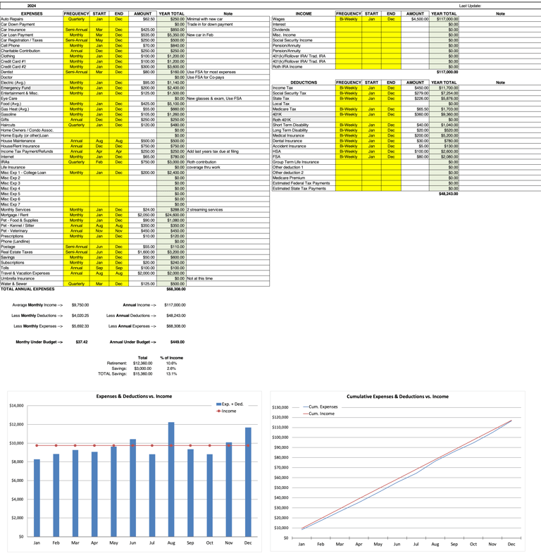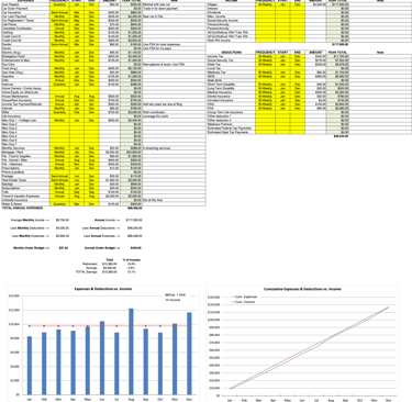 The Simple Budget - Monthly spreadsheet puts your annual finances on 1 page, making it easy to update throughout the year. Simply enter your income and deductions from your check stub, then balance them against your planned month-by-month expenses. Graphs show income/deductions vs. expenses and cumulative spending and income throughout the year. Single & Couple tabs provided.